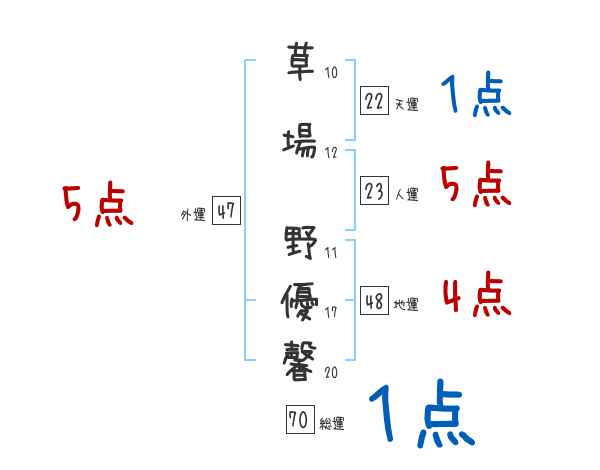 外運![]() | 草場野優馨さんの外運は47画の5つ星!実力が開花し発展する円満な人生。財に恵まれる。 生活面を象徴する運勢です。外部から受ける影響力を表し、結婚運、家庭運や職場、環境への順応性を表します。 |