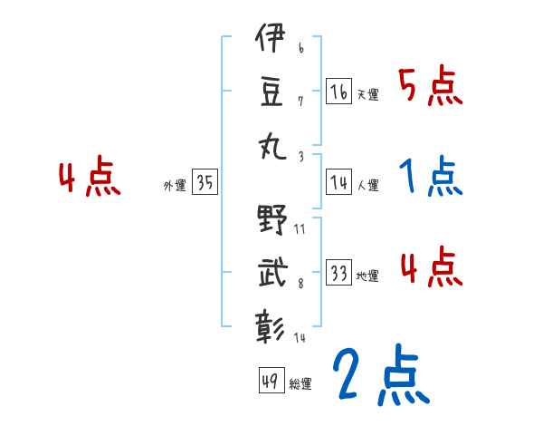 外運![]() | 伊豆丸野武彰さんの外運は35画の4つ星!温厚な性格で感受性が高い。穏和な性格で人望が厚い。 生活面を象徴する運勢です。外部から受ける影響力を表し、結婚運、家庭運や職場、環境への順応性を表します。 |