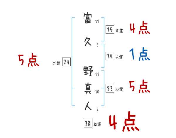 外運![]() | 富久野真人さんの外運は24画の5つ星!家庭運が良く順調な人生。金運にも恵まれる。 生活面を象徴する運勢です。外部から受ける影響力を表し、結婚運、家庭運や職場、環境への順応性を表します。 |
