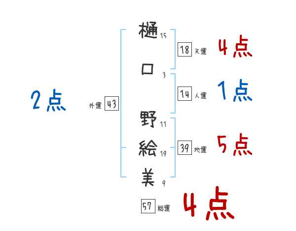 外運![]() | 樋口野絵美さんの外運は43画の2つ星!頑固な性格で独立心が強いかも。やや非現実的で浪費に注意しましょう。 生活面を象徴する運勢です。外部から受ける影響力を表し、結婚運、家庭運や職場、環境への順応性を表します。 |