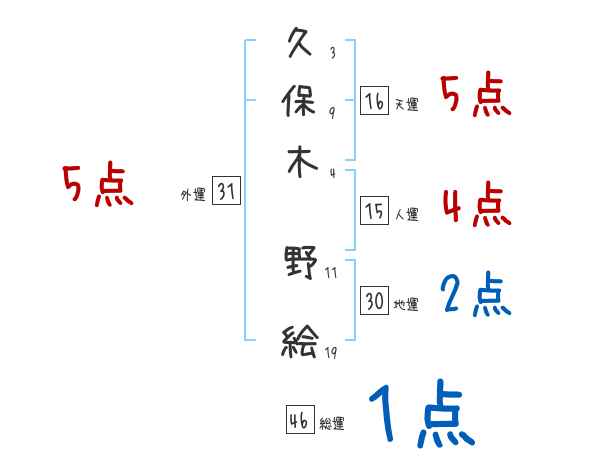 総運![]() | 久保木野絵さんの総運は46画の1つ星!迷走することが多く苦労するかも。目先のことにとらわれないように。 あなたの人生を表す1番重要な運勢です。生涯を通じて影響する総合運となり、主に50歳以降の晩年期に影響を及ぼします。 |