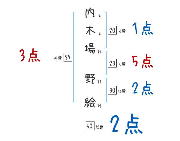外運![]() | 内木場野絵さんの外運は27画の3つ星!頭脳明晰だが強情で摩擦が多い傾向。孤立に注意。 生活面を象徴する運勢です。外部から受ける影響力を表し、結婚運、家庭運や職場、環境への順応性を表します。 |