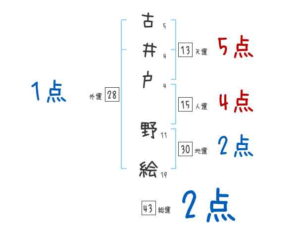 外運![]() | 古井戸野絵さんの外運は28画の1つ星!家庭環境に注意。スポーツで活躍できる能力があるかも。 生活面を象徴する運勢です。外部から受ける影響力を表し、結婚運、家庭運や職場、環境への順応性を表します。 |