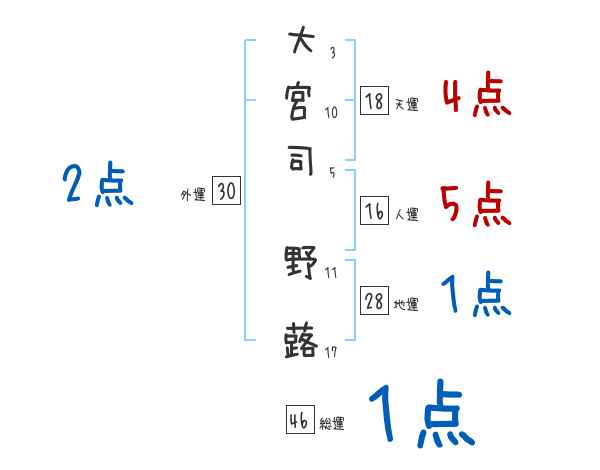 天運![]() | 大宮司野蕗さんの天運は18画の4つ星!情熱的で剛気。忍耐力があり信頼される。 家系が持つ宿命的な運勢を表します。祖先から受け継いだ苗字ですので自分の力が及びません。家柄を象徴します。 |