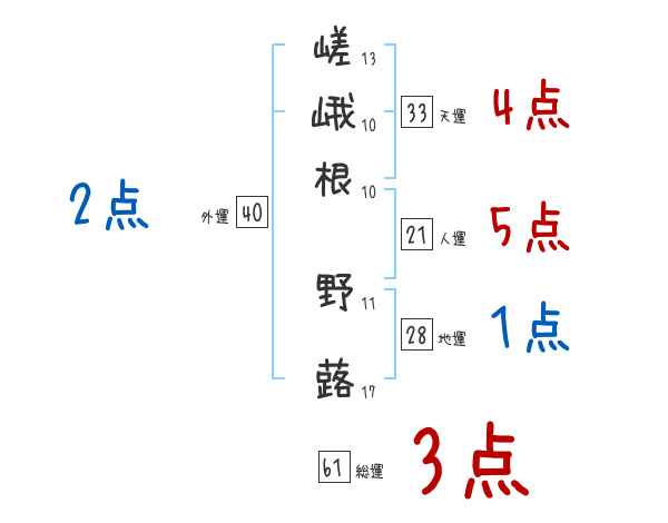 人運![]() | 嵯峨根野蕗さんの人運は21画の5つ星!統率力がある。独立し成功する。名誉を手に入れる。 性格や才能などを表す2番目に重要な運勢です。人間関係や協調性、社会的な成功に影響します。主に20歳から50歳ぐらいまでの中年期の運勢を表します。 |