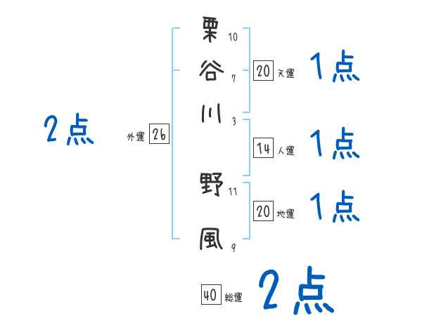 総運![]() | 栗谷川野風さんの総運は40画の2つ星!自信過剰で物事に固執するためトラブルに注意。 あなたの人生を表す1番重要な運勢です。生涯を通じて影響する総合運となり、主に50歳以降の晩年期に影響を及ぼします。 |