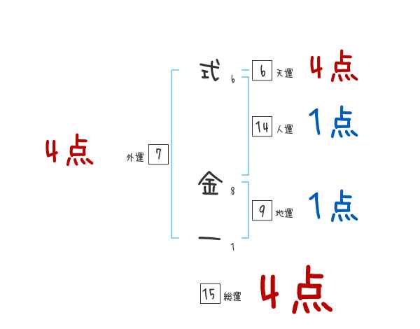 天運![]() | 式金一さんの天運は6画の4つ星!慎重な努力家で信頼を得る。誠実な精神で向上心に優れる。 家系が持つ宿命的な運勢を表します。祖先から受け継いだ苗字ですので自分の力が及びません。家柄を象徴します。 |