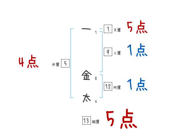 天運![]() | 一金太さんの天運は1画の5つ星!行動力、指導力があり出世し繁栄する。幸運に恵まれる。 家系が持つ宿命的な運勢を表します。祖先から受け継いだ苗字ですので自分の力が及びません。家柄を象徴します。 |