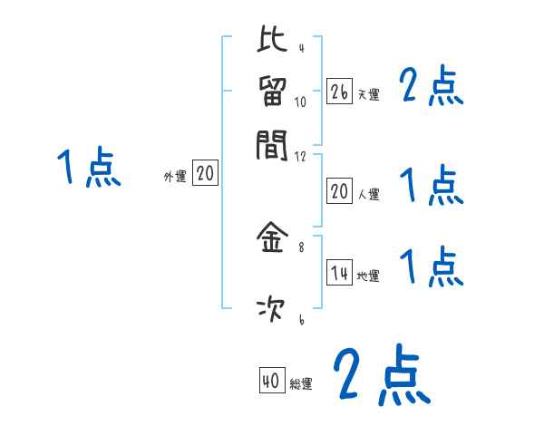 総運![]() | 比留間金次さんの総運は40画の2つ星!自信過剰で物事に固執するためトラブルに注意。 あなたの人生を表す1番重要な運勢です。生涯を通じて影響する総合運となり、主に50歳以降の晩年期に影響を及ぼします。 |