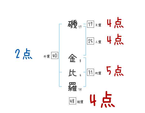 外運![]() | 磯金比羅さんの外運は40画の2つ星!自信過剰で物事に固執するためトラブルに注意。 生活面を象徴する運勢です。外部から受ける影響力を表し、結婚運、家庭運や職場、環境への順応性を表します。 |