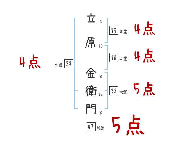 地運![]() | 立原金衛門さんの地運は32画の5つ星!柔軟性があり成功する。チャンスが多く金運が良い。 個性を表す基礎的な運勢です。性格形成や対人関係、行動力など家庭環境に影響されます。主に誕生してから20歳くらいまでの若年期の運勢を表します。 |