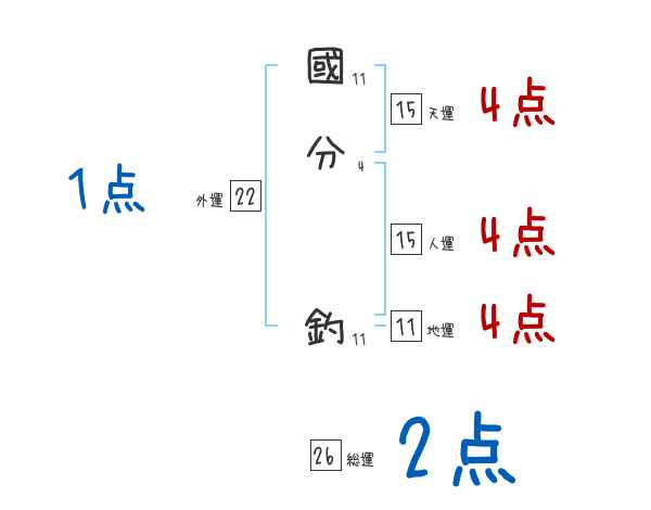 外運![]() | 國分釣さんの外運は22画の1つ星!努力することが苦手ないっぽう手先が器用。芸術性にも優れる。 生活面を象徴する運勢です。外部から受ける影響力を表し、結婚運、家庭運や職場、環境への順応性を表します。 |