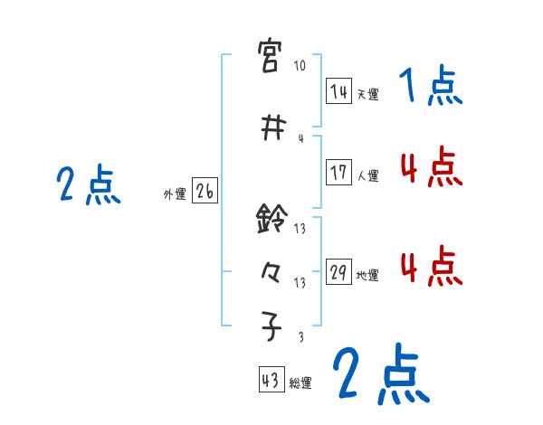外運![]() | 宮井鈴々子さんの外運は26画の2つ星!波瀾万丈かも。信頼できる人を大事にしましょう。 生活面を象徴する運勢です。外部から受ける影響力を表し、結婚運、家庭運や職場、環境への順応性を表します。 |