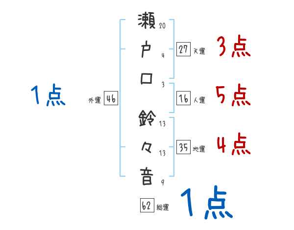 | 人運  | 瀬戸口鈴々音さんの人運は16画の5つ星!人望が厚く大きく発展する。逆転成功が見える。性格や才能などを表す2番目に重要な運勢です。人間関係や協調性、社会的な成功に影響します。主に20歳から50歳ぐらいまでの中年期の運勢を表します。 |