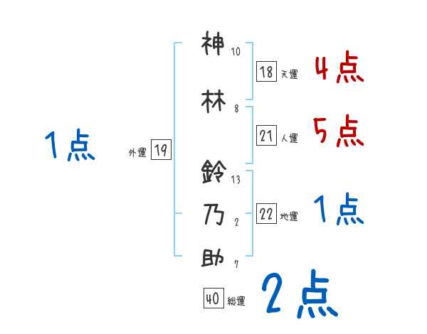 地運![]() | 神林鈴乃助さんの地運は22画の1つ星!努力することが苦手ないっぽう手先が器用。芸術性にも優れる。 個性を表す基礎的な運勢です。性格形成や対人関係、行動力など家庭環境に影響されます。主に誕生してから20歳くらいまでの若年期の運勢を表します。 |