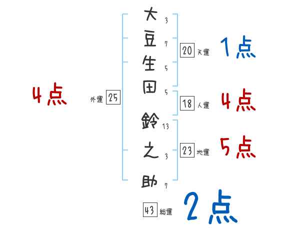 総運![]() | 大豆生田鈴之助さんの総運は43画の2つ星!頑固な性格で独立心が強いかも。やや非現実的で浪費に注意しましょう。 あなたの人生を表す1番重要な運勢です。生涯を通じて影響する総合運となり、主に50歳以降の晩年期に影響を及ぼします。 |
