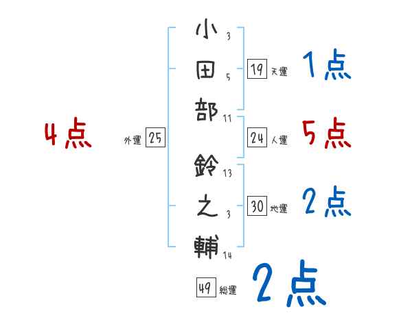 人運![]() | 小田部鈴之輔さんの人運は24画の5つ星!家庭運が良く順調な人生。金運にも恵まれる。 性格や才能などを表す2番目に重要な運勢です。人間関係や協調性、社会的な成功に影響します。主に20歳から50歳ぐらいまでの中年期の運勢を表します。 |