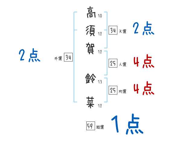 総運![]() | 高須賀鈴菜さんの総運は59画の1つ星!意志の弱さであきらめることが多いかも。粘り強さが必要。 あなたの人生を表す1番重要な運勢です。生涯を通じて影響する総合運となり、主に50歳以降の晩年期に影響を及ぼします。 |