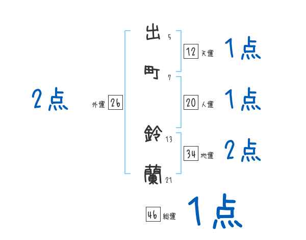 外運![]() | 出町鈴蘭さんの外運は26画の2つ星!波瀾万丈かも。信頼できる人を大事にしましょう。 生活面を象徴する運勢です。外部から受ける影響力を表し、結婚運、家庭運や職場、環境への順応性を表します。 |