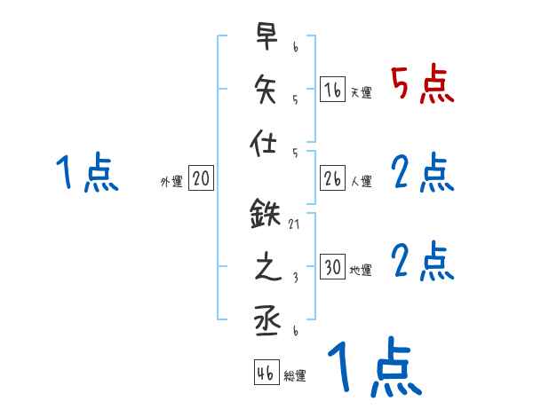 天運![]() | 早矢仕鉄之丞さんの天運は16画の5つ星!人望が厚く大きく発展する。逆転成功が見える。 家系が持つ宿命的な運勢を表します。祖先から受け継いだ苗字ですので自分の力が及びません。家柄を象徴します。 |