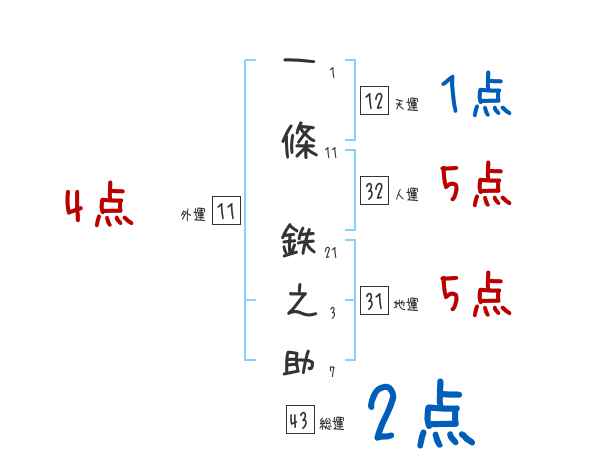 人運![]() | 一條鉄之助さんの人運は32画の5つ星!柔軟性があり成功する。チャンスが多く金運が良い。 性格や才能などを表す2番目に重要な運勢です。人間関係や協調性、社会的な成功に影響します。主に20歳から50歳ぐらいまでの中年期の運勢を表します。 |