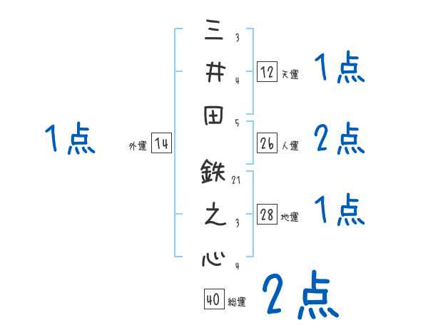 天運![]() | 三井田鉄之心さんの天運は12画の1つ星!簡単な失敗で諦めてしまいやすいかも。着実に行動すると良いでしょう。 家系が持つ宿命的な運勢を表します。祖先から受け継いだ苗字ですので自分の力が及びません。家柄を象徴します。 |