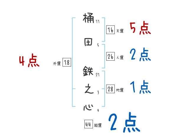 総運![]() | 桶田鉄之心さんの総運は44画の2つ星!誠実で慎重な性格。物事を考えすぎないように注意しましょう。 あなたの人生を表す1番重要な運勢です。生涯を通じて影響する総合運となり、主に50歳以降の晩年期に影響を及ぼします。 |