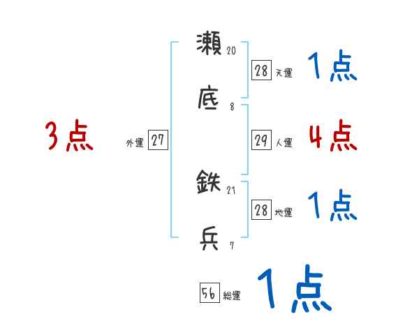 天運![]() | 瀬底鉄兵さんの天運は28画の1つ星!家庭環境に注意。スポーツで活躍できる能力があるかも。 家系が持つ宿命的な運勢を表します。祖先から受け継いだ苗字ですので自分の力が及びません。家柄を象徴します。 |