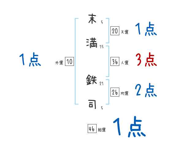 総運![]() | 末満鉄司さんの総運は46画の1つ星!迷走することが多く苦労するかも。目先のことにとらわれないように。 あなたの人生を表す1番重要な運勢です。生涯を通じて影響する総合運となり、主に50歳以降の晩年期に影響を及ぼします。 |