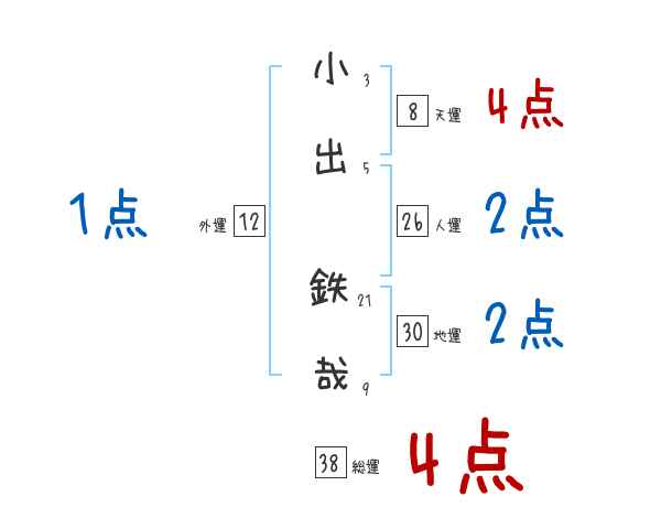 天運![]() | 小出鉄哉さんの天運は8画の4つ星!勤勉家。根気強く努力し成功する。忍耐力がある。 家系が持つ宿命的な運勢を表します。祖先から受け継いだ苗字ですので自分の力が及びません。家柄を象徴します。 |