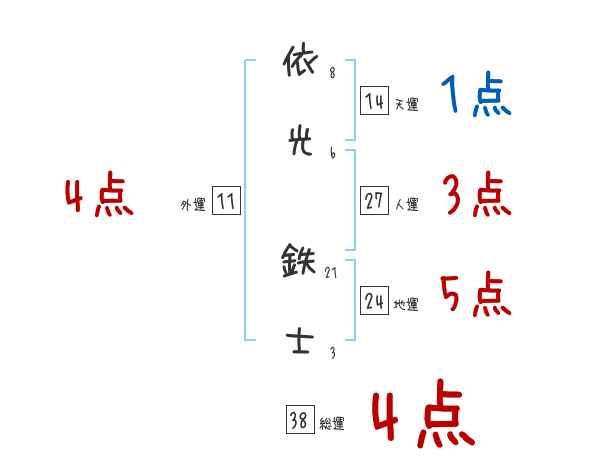 天運![]() | 依光鉄士さんの天運は14画の1つ星!人に対して優しいがストレスを溜め込みがち。人間関係のトラブルを避けるよう気をつけましょう。 家系が持つ宿命的な運勢を表します。祖先から受け継いだ苗字ですので自分の力が及びません。家柄を象徴します。 |