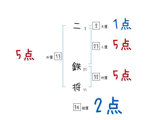 地運![]() | 二鉄将さんの地運は32画の5つ星!柔軟性があり成功する。チャンスが多く金運が良い。 個性を表す基礎的な運勢です。性格形成や対人関係、行動力など家庭環境に影響されます。主に誕生してから20歳くらいまでの若年期の運勢を表します。 |
