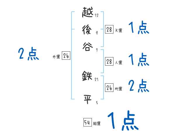 地運![]() | 越後谷鉄平さんの地運は26画の2つ星!波瀾万丈かも。信頼できる人を大事にしましょう。 個性を表す基礎的な運勢です。性格形成や対人関係、行動力など家庭環境に影響されます。主に誕生してから20歳くらいまでの若年期の運勢を表します。 |
