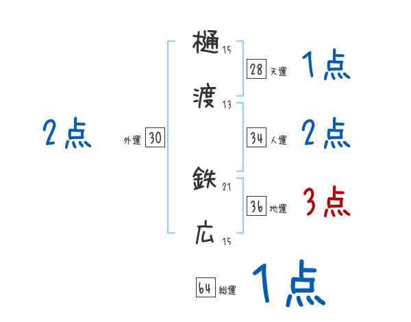 地運![]() | 樋渡鉄広さんの地運は36画の3つ星!先見性が豊かです。多少神経質で苦労することも。 個性を表す基礎的な運勢です。性格形成や対人関係、行動力など家庭環境に影響されます。主に誕生してから20歳くらいまでの若年期の運勢を表します。 |