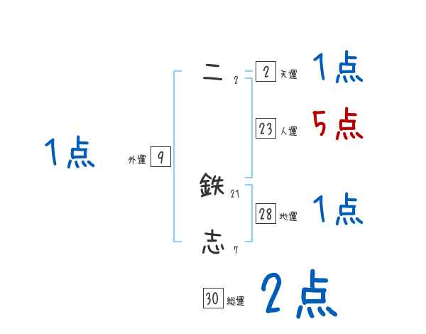地運![]() | 二鉄志さんの地運は28画の1つ星!家庭環境に注意。スポーツで活躍できる能力があるかも。 個性を表す基礎的な運勢です。性格形成や対人関係、行動力など家庭環境に影響されます。主に誕生してから20歳くらいまでの若年期の運勢を表します。 |