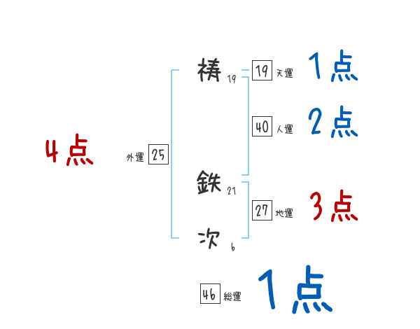 天運![]() | 祷鉄次さんの天運は19画の1つ星!優れた才能を持ちますが、協調性が足りないことも。周りの人と協力する事を意識しましょう。 家系が持つ宿命的な運勢を表します。祖先から受け継いだ苗字ですので自分の力が及びません。家柄を象徴します。 |