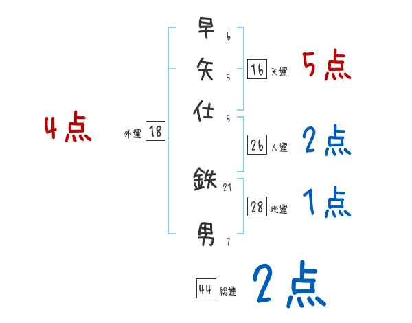 総運![]() | 早矢仕鉄男さんの総運は44画の2つ星!誠実で慎重な性格。物事を考えすぎないように注意しましょう。 あなたの人生を表す1番重要な運勢です。生涯を通じて影響する総合運となり、主に50歳以降の晩年期に影響を及ぼします。 |