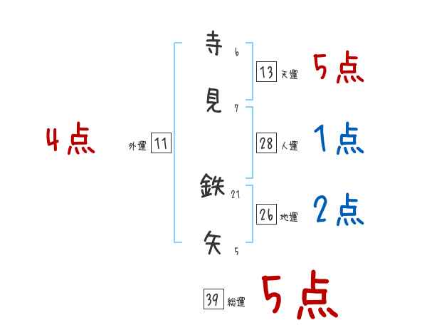 天運![]() | 寺見鉄矢さんの天運は13画の5つ星!才能に恵まれ人気がある。名声を手に入れる。円満な人生。 家系が持つ宿命的な運勢を表します。祖先から受け継いだ苗字ですので自分の力が及びません。家柄を象徴します。 |
