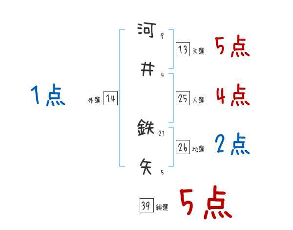 総運![]() | 河井鉄矢さんの総運は39画の5つ星!社交性に優れ人望が厚い。人の上に立ち成功する。 あなたの人生を表す1番重要な運勢です。生涯を通じて影響する総合運となり、主に50歳以降の晩年期に影響を及ぼします。 |