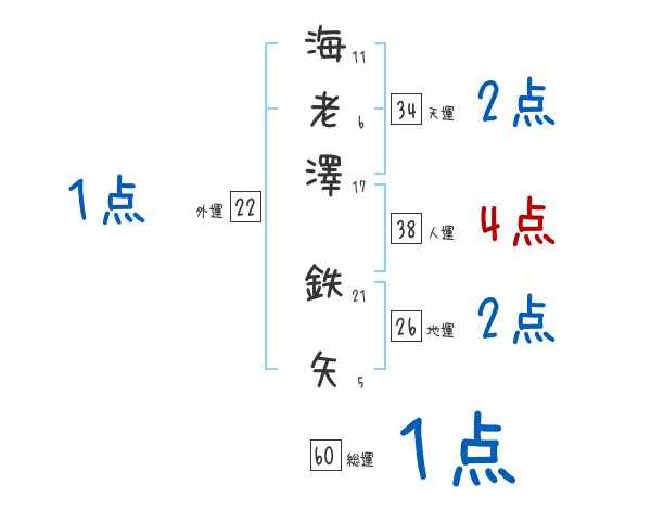 外運![]() | 海老澤鉄矢さんの外運は22画の1つ星!努力することが苦手ないっぽう手先が器用。芸術性にも優れる。 生活面を象徴する運勢です。外部から受ける影響力を表し、結婚運、家庭運や職場、環境への順応性を表します。 |