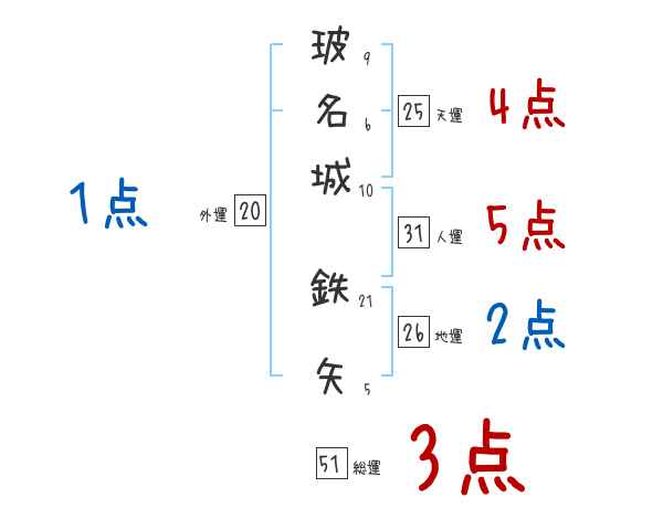 総運![]() | 玻名城鉄矢さんの総運は51画の3つ星!変化が激しく、危険に注意。堅実な性格。 あなたの人生を表す1番重要な運勢です。生涯を通じて影響する総合運となり、主に50歳以降の晩年期に影響を及ぼします。 |