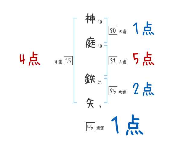 外運![]() | 神庭鉄矢さんの外運は15画の4つ星!人徳があり出世する。順調に物事を進め円満な人生。 生活面を象徴する運勢です。外部から受ける影響力を表し、結婚運、家庭運や職場、環境への順応性を表します。 |