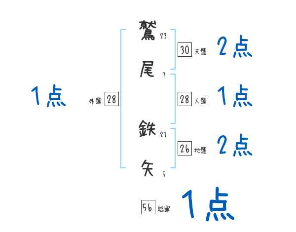 天運![]() | 鷲尾鉄矢さんの天運は30画の2つ星!浮き沈みの激しさに注意しましょう。 家系が持つ宿命的な運勢を表します。祖先から受け継いだ苗字ですので自分の力が及びません。家柄を象徴します。 |