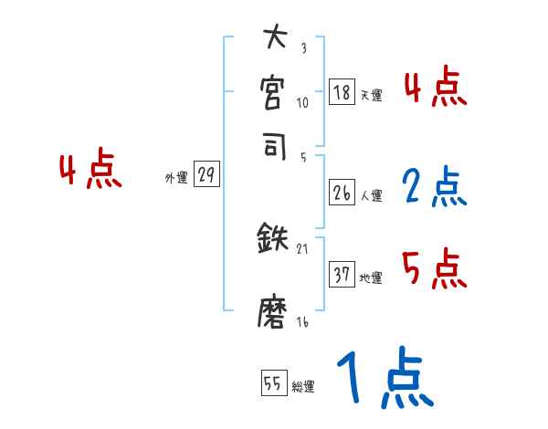 天運![]() | 大宮司鉄磨さんの天運は18画の4つ星!情熱的で剛気。忍耐力があり信頼される。 家系が持つ宿命的な運勢を表します。祖先から受け継いだ苗字ですので自分の力が及びません。家柄を象徴します。 |