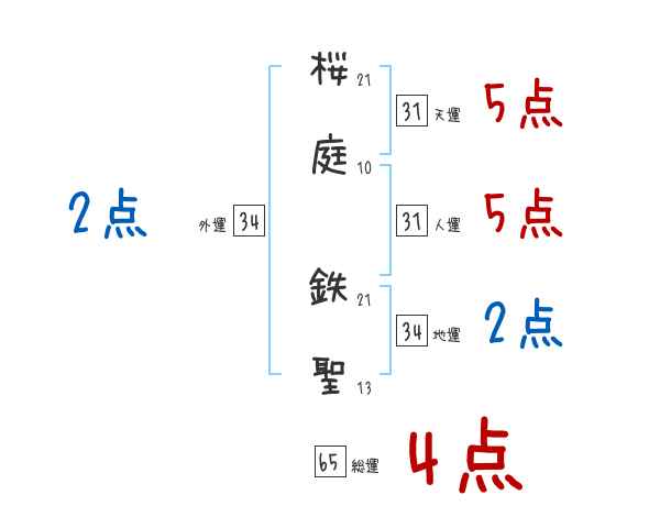 総運![]() | 桜庭鉄聖さんの総運は65画の4つ星!幸運に恵まれ繁栄する。包容力がある。 あなたの人生を表す1番重要な運勢です。生涯を通じて影響する総合運となり、主に50歳以降の晩年期に影響を及ぼします。 |