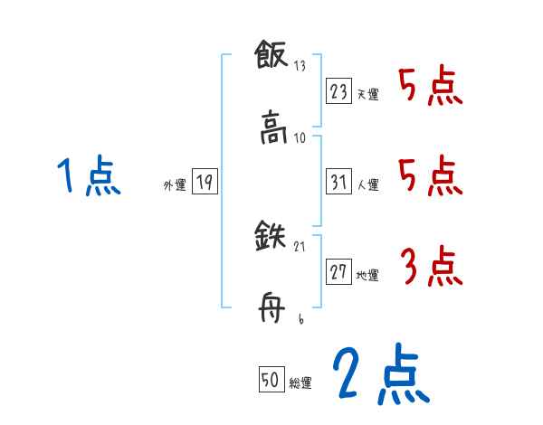 天運![]() | 飯高鉄舟さんの天運は23画の5つ星!想像力に優れ活力がある。一代で成功し名誉を手に入れる。 家系が持つ宿命的な運勢を表します。祖先から受け継いだ苗字ですので自分の力が及びません。家柄を象徴します。 |