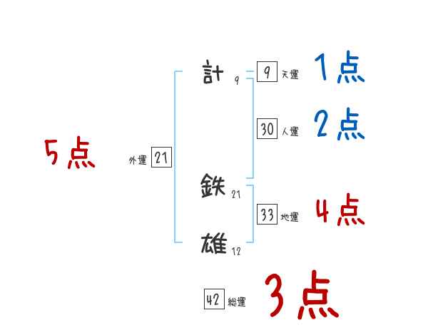 天運![]() | 計鉄雄さんの天運は9画の1つ星!消極的で才能を発揮することが苦手なことも。周りの意見に耳を傾けましょう。 家系が持つ宿命的な運勢を表します。祖先から受け継いだ苗字ですので自分の力が及びません。家柄を象徴します。 |