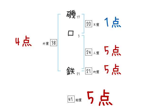 外運![]() | 磯口鉄さんの外運は38画の4つ星!温厚な性格で技術的な才能を発揮する。職人的な仕事に向いている。 生活面を象徴する運勢です。外部から受ける影響力を表し、結婚運、家庭運や職場、環境への順応性を表します。 |