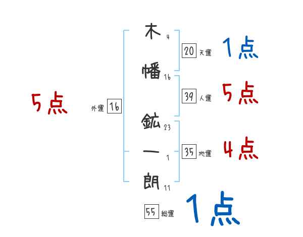 外運![]() | 木幡鉱一朗さんの外運は16画の5つ星!人望が厚く大きく発展する。逆転成功が見える。 生活面を象徴する運勢です。外部から受ける影響力を表し、結婚運、家庭運や職場、環境への順応性を表します。 |