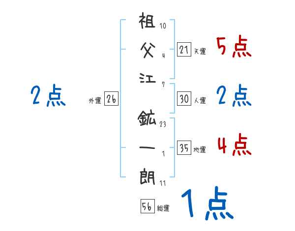 天運![]() | 祖父江鉱一朗さんの天運は21画の5つ星!統率力がある。独立し成功する。名誉を手に入れる。 家系が持つ宿命的な運勢を表します。祖先から受け継いだ苗字ですので自分の力が及びません。家柄を象徴します。 |
